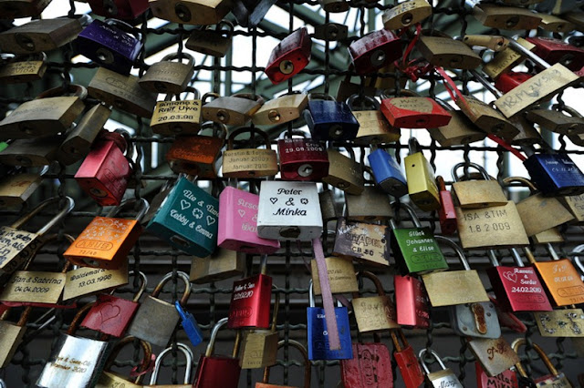 Imaginile de fata reprezinta o idee cat se poate de originala (si romantica, poate 😀 ) pentru a dovedi lumii intregi iubirea ce o porti cuiva! Locul acesta se afla in Cologne, Germania, mai exact pe podul Hohenzollernbruecke din orasul german! Modul acesta de a manifesta iubirea are la baza o istorioara destul de interesanta, bazata pe un fapt real intamplat in timpul primului razboi mondial, undeva in Serbia, la Vrnjačka Banja, acolo unde, spune legenda, iubirea dintre doi tineri ,Reljia si Nada, a fost distrusa de trimiterea pe front a baiatului (Reljia) iar ca respect pentru iubirea ce.i purta fata a gasit de cuviinta sa puna un lacat cu numele lor inscriptionat pe unul dintre pilonii podului unde se intalneau in fiecare seara! Cum anii au trecut iar micuta istorioara s.a transmis din generatie in generatie, cuplurile de indragostiti au urmat exemplul Nadei si ”si.au legat ” iubirea cu cate un lacat de acelasi pod! Traditia in micul orasel sarbesc s.a stins undeva dupa cel de.al doilea razboi mondial, podul insa mai exista si astazi! Undeva mai la nord vest, in schimb in Cologne, Germania aceasta practica a fost indragita si imediat adoptata de indragostitii de toate varstele, ce a urmat va convingeti si singuri 😉