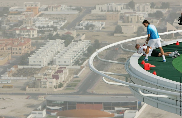 Fotografiile ce urmeaza nu sunt noi, dar sunt foarte spectaculoase, asta prin prisma locului unde si de unde au fost facute, hotelul Burj Al Arab din Dubai! Inaltimea estimata unde este situat terenul de tenis este aproximativ 300m !